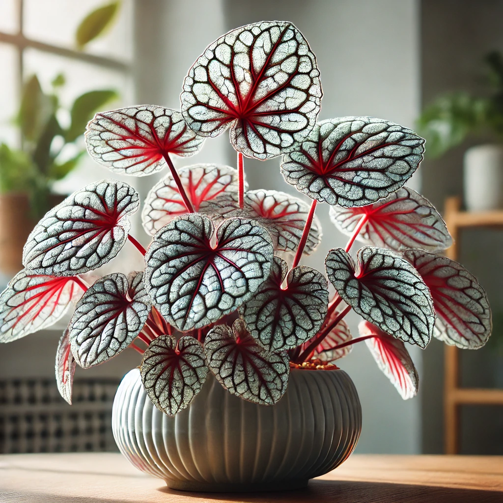 베고니아 마큘라타는 반짝이는 은색 물방울 무늬 잎과 붉은색 뒷면이 매력적인 식물이다.